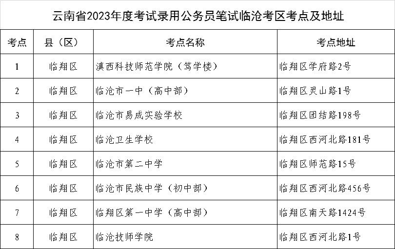 本次考試臨滄考區(qū)共設(shè)置8個考點,分別安排在滇西科技師范學(xué)院(篤學(xué)樓)、臨滄市第一中學(xué)(高中部)、臨滄市易成實驗學(xué)校、臨滄衛(wèi)生學(xué)校、臨滄市第二中學(xué)、臨滄市民族中學(xué)(初中部)、臨翔區(qū)第一中學(xué)(高中部)、臨滄技師學(xué)院。具體考點和考場詳見附件。