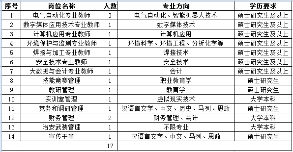 根據(jù)學(xué)校發(fā)展需要,2023年首鋼技師學(xué)院面向首鋼集團(tuán)及社會(huì)公開招聘17人,其中教師崗9人,專業(yè)管理崗8人。公告如下: