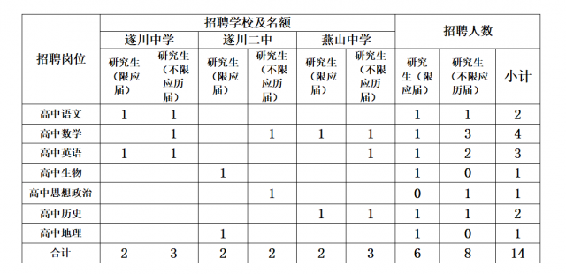 為滿足學(xué)校教育教學(xué)工作需要,經(jīng)縣委編委研究同意,并經(jīng)市人社局核準(zhǔn)備案,遂川中學(xué)、遂川二中、燕山中學(xué)面向高校招聘14名碩士研究生及以上學(xué)歷的優(yōu)秀高中教師,現(xiàn)將有關(guān)事項(xiàng)公告如下: