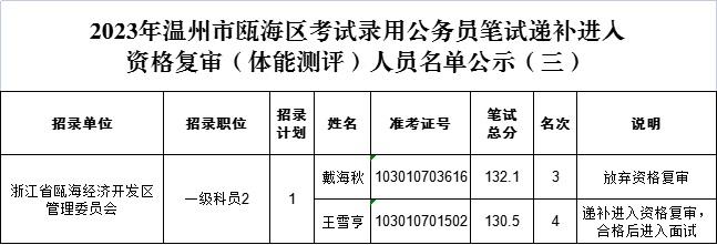 2023年溫州市甌海區(qū)考試錄用公務員筆試遞補進入資格復審(體能測評)人員名單公示(三)