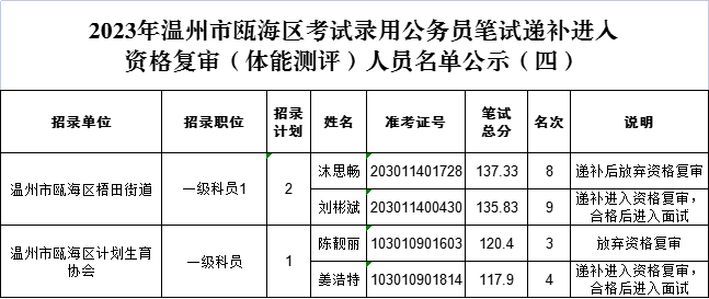 2023年溫州市甌海區(qū)考試錄用公務員筆試遞補進入資格復審(體能測評)人員名單公示(四)