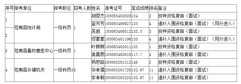 2023年蒼南縣各級機關(guān)考試錄用公務(wù)員遞補入圍資格復(fù)審人員名單