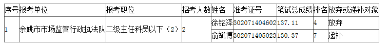 關(guān)于公布2023年余姚市各級(jí)機(jī)關(guān)單位考試錄用公務(wù)員放棄資格復(fù)審(體能測(cè)評(píng))及遞補(bǔ)人員名單的公告(二)
