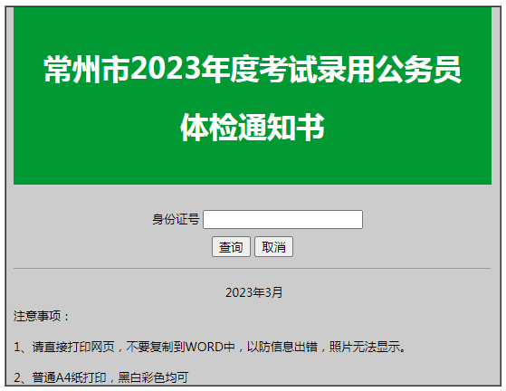 常州市2023年度考試錄用公務(wù)員體檢通知書