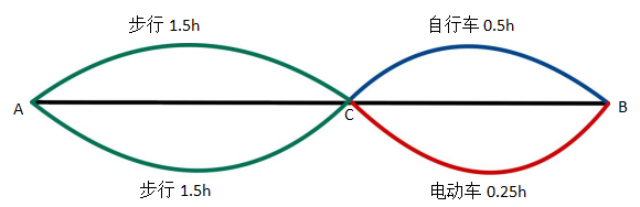 小明的步行速度為1米/秒,從A到B地步行需要3小時(shí),騎自行車(chē)需要1小時(shí),電動(dòng)車(chē)的速度是自行車(chē)速度的兩倍,現(xiàn)在小明從A地出發(fā),步行1.5小時(shí)后騎自行車(chē)到B地,然后返回途中先騎電動(dòng)車(chē)走完一半路程,再步行返回A地,則小明往返A(chǔ)、B兩地共用多少小時(shí)?( )