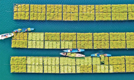 浙江省杭州市淳安縣在千島湖典型庫灣、入湖口等區(qū)域,運用生態(tài)浮島水上無土栽培技術(shù)種植水生蔬菜,努力探索“兩山”價值轉(zhuǎn)化新路徑。圖為2023年2月21日,工作人員正在采摘水生蔬菜。人民圖片楊波/攝