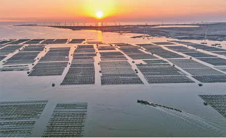 近年來,山東省榮成市大力推行科技興海、以養(yǎng)興漁,積極推廣“淺海多營養(yǎng)層次生態(tài)養(yǎng)殖模式”。圖為石島管理區(qū)桑溝灣海洋牧場網(wǎng)箱養(yǎng)殖區(qū)(2023年2月16日攝)。人民圖片李信君/攝