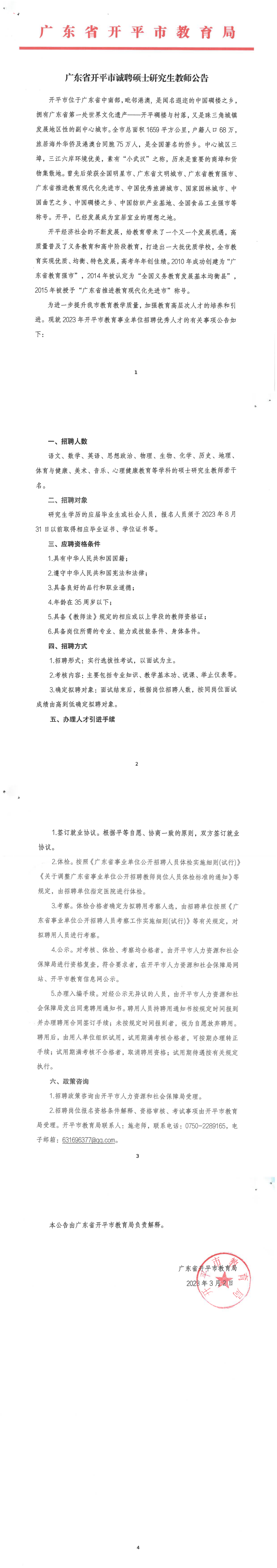廣東江門(mén)開(kāi)平市誠(chéng)聘碩士研究生教師公告