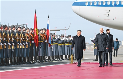 俄方在機(jī)場(chǎng)舉行隆重迎賓儀式。軍樂團(tuán)奏中俄兩國國歌。習(xí)近平檢閱俄羅斯三軍儀仗隊(duì)并觀看分列式。