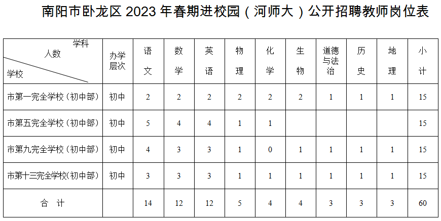 1、南陽市臥龍區(qū)2023年春期進校園(河師大)招聘教師崗位表