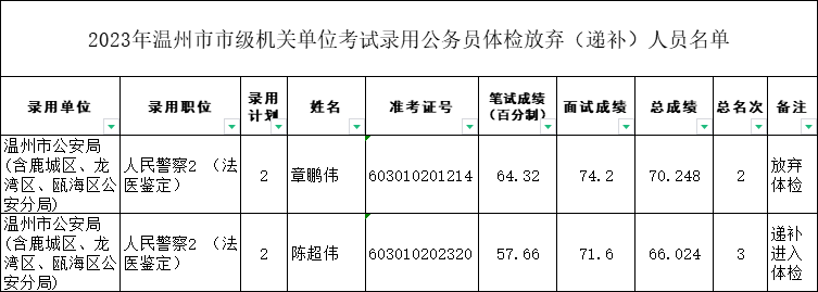 2023年浙江公務(wù)員考試溫州市市級(jí)機(jī)關(guān)體檢放棄(遞補(bǔ))人員名單
