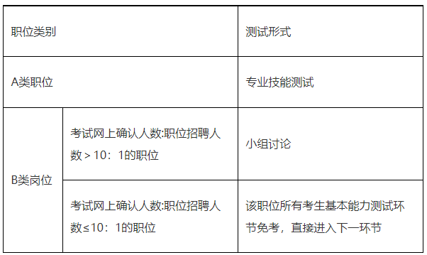 2.基本能力測試主要采取專業(yè)技能測試、小組討論等形式,對考生進行考察。各職位具體考核形式見下表。