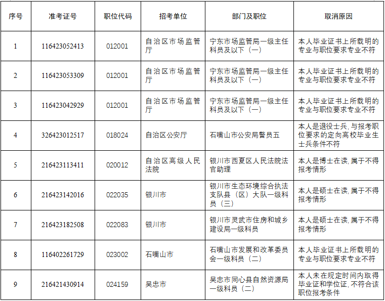 根據(jù)《寧夏回族自治區(qū)2023年考試錄用公務(wù)員公告》相關(guān)規(guī)定,自治區(qū)公務(wù)員局會(huì)同有關(guān)部門及各招錄機(jī)關(guān)對(duì)2023年全區(qū)考試錄用公務(wù)員擬進(jìn)入面試的報(bào)考者進(jìn)行了資格復(fù)審。復(fù)審中發(fā)現(xiàn),部分報(bào)考者不符合職位資格條件,部分報(bào)考者放棄面試資格,個(gè)別職位達(dá)不到面試開考比例。經(jīng)自治區(qū)公務(wù)員主管部門研究,決定取消部分報(bào)考者面試資格,降低部分職位面試開考比例?,F(xiàn)將有關(guān)情況公告如下: