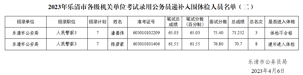 2023年浙江公務(wù)員考試溫州樂清市遞補(bǔ)入圍體檢人員名單(二)