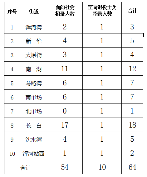 本次公開招錄社區(qū)工作者64人,其中面向社會(huì)招錄54人,定向招錄退役士兵10人。