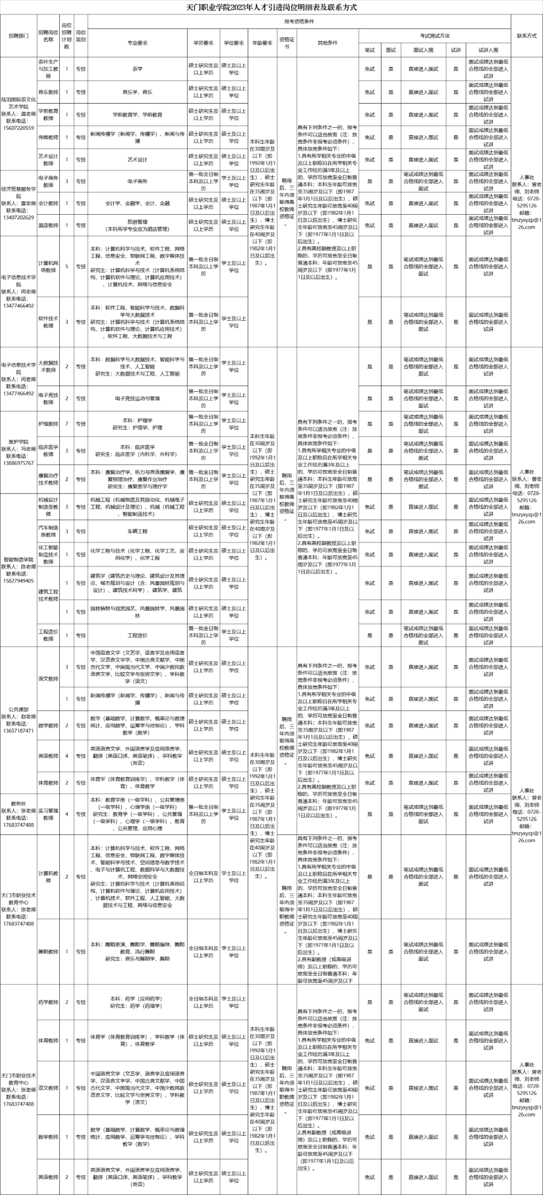 1.招聘崗位、招聘人數(shù)、專業(yè)要求、學(xué)歷層次及崗位相關(guān)要求詳見《天門職業(yè)學(xué)院2023年人才引進崗位明細表及聯(lián)系方式》(附件1)。