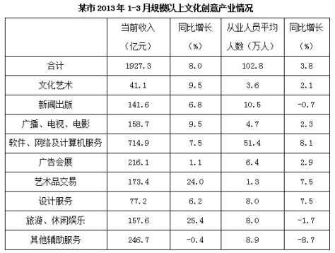 【答案】A【解析】題干要求找出2013年一季度平均每名從業(yè)人員創(chuàng)造的收入高于上年的產(chǎn)業(yè),即判斷平均數(shù)的變化。平均每名從業(yè)人員創(chuàng)造的收入=當前收入÷從業(yè)人員平均人數(shù),只需找出當前收入增長率>從業(yè)人員平均人數(shù)增長率的產(chǎn)業(yè)即可。材料中符合條件的產(chǎn)業(yè)有文化藝術(9.5%>2.1%),新聞出版(6.8%>-0.7%),廣播、電視、電影(9.5%>2.3%),藝術品交易(24.0%>7.5%),旅游、休閑娛樂(25.4%>-1.7%),其他輔助服務(-0.4%>-8.7%),結合選項,選擇A項。