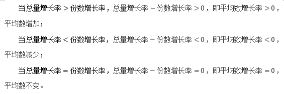 ”,若該式為正,則現(xiàn)期平均數(shù)較基期的上升;若該式為負,則現(xiàn)期平均數(shù)較基期的下降。其中,“1+份數(shù)增長率”一般為正,所以,判斷平均數(shù)變化只需比較總量增長率和份數(shù)增長率的大小即可。分如下三種情況: