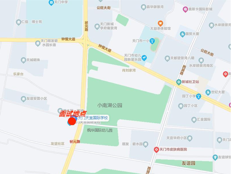 天門市天宜國(guó)際學(xué)校(天門市高新園熊河大道6號(hào),熊河大道與狀元路交叉路口往西南約170米,市內(nèi)乘坐9路車在天宜學(xué)校站下車可達(dá))。