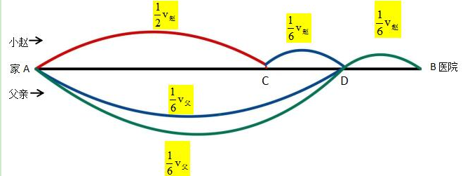 例題:小趙騎車去醫(yī)院看病,父親在發(fā)現(xiàn)小趙沒有帶醫(yī)??〞r(shí)以60km/h的速度開車追上小趙,把醫(yī)保卡交給他并立即返回。小趙拿到醫(yī)保卡后又騎了10分鐘到達(dá)醫(yī)院,小趙父親也同時(shí)到家。假如小趙從家到醫(yī)院一共用時(shí)50分鐘,則小趙的速度為多少km/h?(假定小趙及其父親全程都勻速行駛,忽略父子二人交接卡的時(shí)間)( )