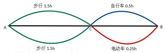 例題:小明的步行速度為1米/秒,從A到B地步行需要3小時(shí),騎自行車需要1小時(shí),電動(dòng)車的速度是自行車速度的兩倍,現(xiàn)在小明從A地出發(fā),步行1.5小時(shí)后騎自行車到B地,然后返回途中先騎電動(dòng)車走完一半路程,再步行返回A地,則小明往返A(chǔ)、B兩地共用多少小時(shí)( )?