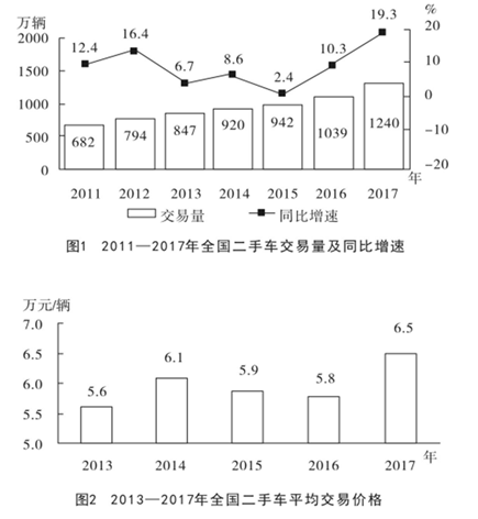 B.2011~2017年,全國二手車交易量同比增速第4高的年份,當(dāng)年二手車平均交易價格高于6萬元