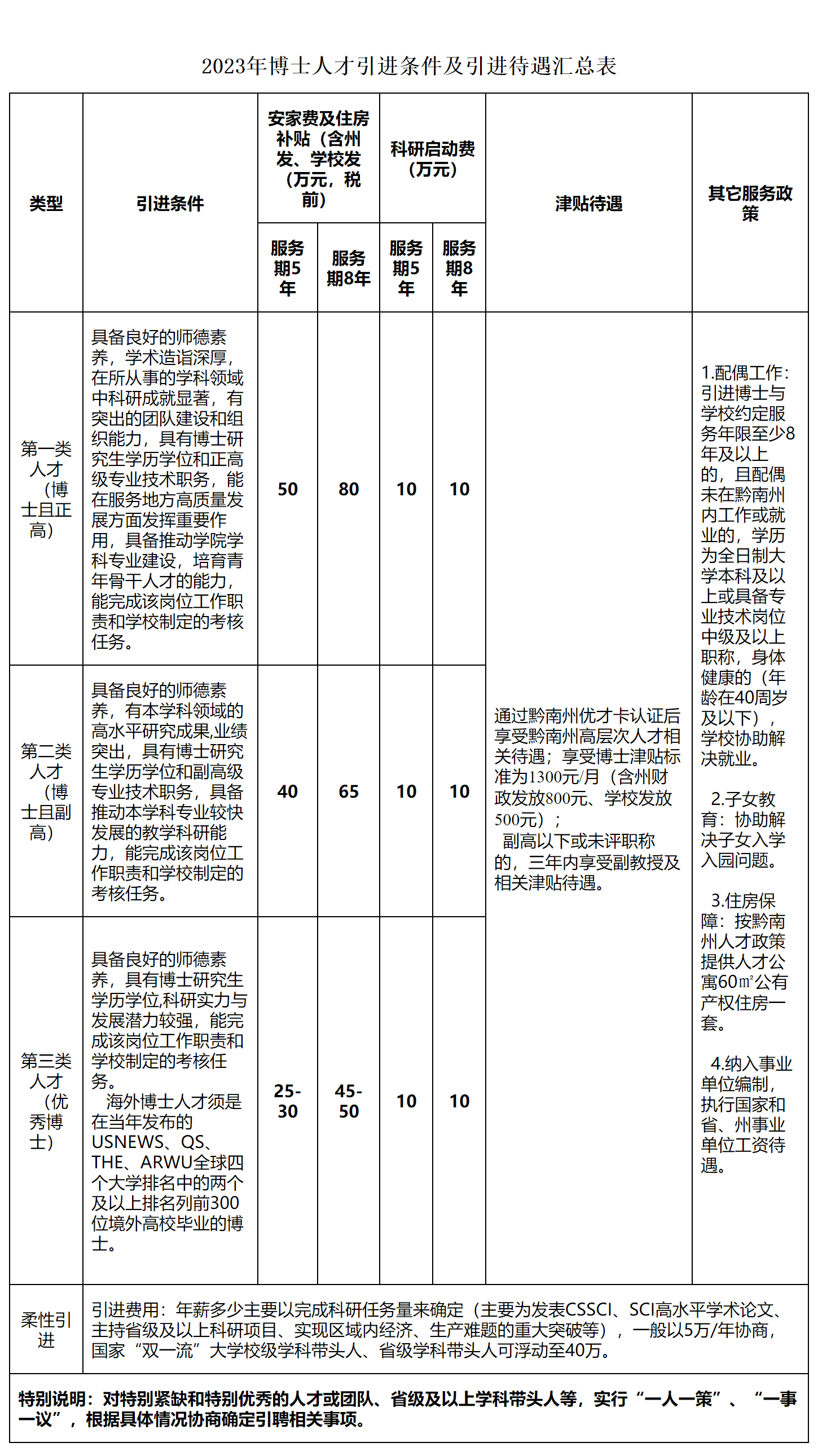 2023年博士人才引進(jìn)條件及引進(jìn)待遇匯總表類型引進(jìn)條件安家費(fèi)及住房補(bǔ)貼(含州發(fā)、學(xué)校發(fā)(萬元,稅前)科研啟動(dòng)費(fèi)(萬元)津貼待遇其它服務(wù)政策服務(wù)期5年服務(wù)期8年服務(wù)期5年服務(wù)期8年第一類人才(博士且正高)具備良好的師德素養(yǎng),學(xué)術(shù)造詣深厚,在所從事的學(xué)科領(lǐng)域中科研成就顯著,有突出的團(tuán)隊(duì)建設(shè)和組織能力,具有博士研究生學(xué)歷學(xué)位和正高級專業(yè)技術(shù)職務(wù),能在服務(wù)地方高質(zhì)量發(fā)展方面發(fā)揮重要作用,具備推動(dòng)學(xué)院學(xué)科專業(yè)建設(shè),培育青年骨干人才的能力,能完成該崗位工作職責(zé)和學(xué)校制定的考核任務(wù)。50801010通過黔南州優(yōu)才卡認(rèn)證后享受黔南州高層次人才相關(guān)待遇;享受博士津貼標(biāo)準(zhǔn)為1300元/月(含州財(cái)政發(fā)放800元、學(xué)校發(fā)放500元);副高以下或未評職稱的,三年內(nèi)享受副教授及相關(guān)津貼待遇。1.配偶工作:引進(jìn)博士與學(xué)校約定服務(wù)年限至少8年及以上的,且配偶未在黔南州內(nèi)工作或就業(yè)的,學(xué)歷為全日制大學(xué)本科及以上或具備專業(yè)技術(shù)崗位中級及以上職稱,身體健康的(年齡在40周歲及以下),學(xué)校協(xié)助解決就業(yè)。 2.子女教育:協(xié)助解決子女入學(xué)入園問題。 3.住房保障:按黔南州人才政策提供人才公寓60㎡公有產(chǎn)權(quán)住房一套。 4.納入事業(yè)單位編制,執(zhí)行國家和省、州事業(yè)單位工資待遇。第二類人才(博士且副高)具備良好的師德素養(yǎng),有本學(xué)科領(lǐng)域的高水平研究成果,業(yè)績突出,具有博士研究生學(xué)歷學(xué)位和副高級專業(yè)技術(shù)職務(wù),具備推動(dòng)本學(xué)科專業(yè)較快發(fā)展的教學(xué)科研能力,能完成該崗位工作職責(zé)和學(xué)校制定的考核任務(wù)。40651010第三類人才(優(yōu)秀博士)具備良好的師德素養(yǎng),具有博士研究生學(xué)歷學(xué)位,科研實(shí)力與發(fā)展?jié)摿^強(qiáng),能完成該崗位工作職責(zé)和學(xué)校制定的考核任務(wù)。 海外博士人才須是在當(dāng)年發(fā)布的USNEWS、QS、THE、ARWU全球四個(gè)大學(xué)排名中的兩個(gè)及以上排名列前300位境外高校畢業(yè)的博士。25-3045-501010柔性引進(jìn)引進(jìn)費(fèi)用:年薪多少主要以完成科研任務(wù)量來確定(主要為發(fā)表CSSCI、SCI高水平學(xué)術(shù)論文、主持省級及以上科研項(xiàng)目、實(shí)現(xiàn)區(qū)域內(nèi)經(jīng)濟(jì)、生產(chǎn)難題的重大突破等),一般以5萬/年協(xié)商,國家“雙一流”大學(xué)校級學(xué)科帶頭人、省級學(xué)科帶頭人可浮動(dòng)至40萬。特別說明:對特別緊缺和特別優(yōu)秀的人才或團(tuán)隊(duì)、省級及以上學(xué)科帶頭人等,實(shí)行“一人一策”、“一事一議”,根據(jù)具體情況協(xié)商確定引聘相關(guān)事項(xiàng)。