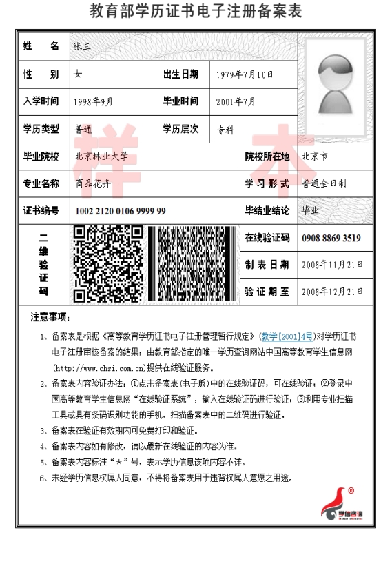 《教育部學(xué)歷證書(shū)電子注冊(cè)備案表》樣本