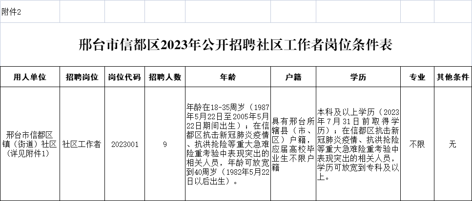 1.招聘崗位人數(shù)和其他具體條件詳見《邢臺市信都區(qū)2023年公開招聘社區(qū)工作者崗位條件表》(附件2),國外留學(xué)生須出具教育部留學(xué)認(rèn)證中心提供的學(xué)歷學(xué)位認(rèn)證書。