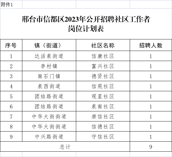 公開招聘社區(qū)工作者共9名,具體崗位計(jì)劃詳見《邢臺市信都區(qū)2023年公開招聘社區(qū)工作者崗位計(jì)劃表》(附件1)。