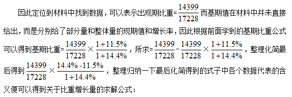 其次,根據(jù)材料所給的數(shù)據(jù)條件,觀察材料是否直接給出現(xiàn)期比重與基期比重,若直接給出,則直接用公式1;若未給,則需結(jié)合所給的現(xiàn)期部分值與部分增長(zhǎng)率、現(xiàn)期整體值與整體增長(zhǎng)率以及公式2列式;