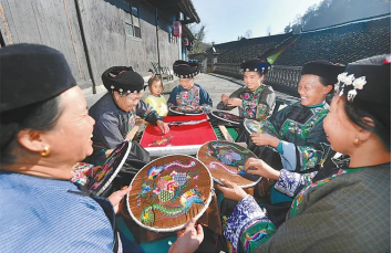 湖南省花垣縣十八洞村因地制宜發(fā)展種植、苗繡、鄉(xiāng)村旅游等特色產業(yè),實現(xiàn)從“輸血”到“造血”的根本轉變,走出了一條產業(yè)興、設施優(yōu)、品位高、保障好、生活美的脫貧致富之路。圖為十八洞村苗繡特產農民專業(yè)合作社的繡娘在生產苗繡產品?!皧^進新時代”主題成就展圖片