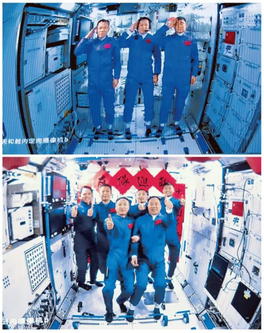 新時代十年,我國經濟實力、科技實力、綜合國力躍上新的大臺階,推進科技自立自強,創(chuàng)新型國家建設取得重大進展。圖為拼版照片:上圖為2021年6月17日神舟十二號3名航天員順利進駐天和核心艙,標志著中國人首次進入自己的空間站(新華社記者金立旺/攝)。下圖為2023年5月30日在北京航天飛行控制中心拍攝的神舟十五號航天員乘組與神舟十六號航天員乘組拍下“全家?!钡漠嬅妫ㄐ氯A社發(fā)韓啟揚/攝)。