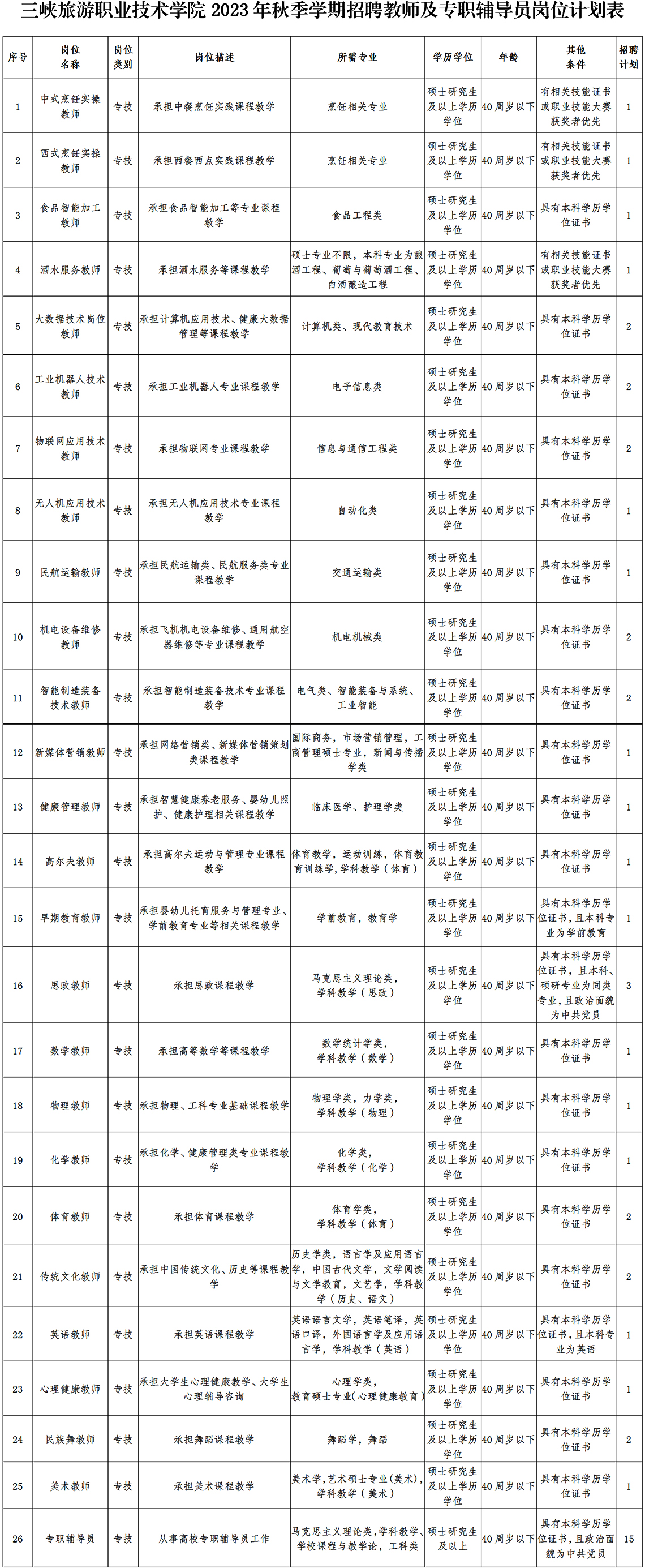 三峽旅游職業(yè)技術(shù)學(xué)院2023年秋季學(xué)期招聘教師及專職輔導(dǎo)員崗位計劃表.docx