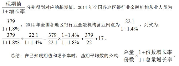 【解析】題目數(shù)據(jù)是2015年,問(wèn)題問(wèn)的是2014年的平均數(shù),也就是求基期平均數(shù),但是已知條件中給出的是現(xiàn)期的總量、份數(shù)以及對(duì)應(yīng)的增長(zhǎng)率,可以通過(guò)