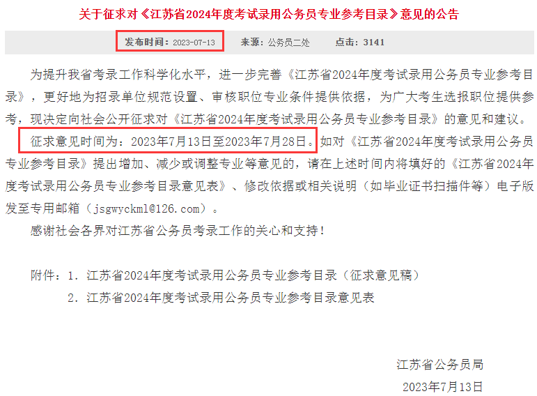 將于2023年7月13日至2023年7月28日期間內征求廣大考生和社會各界對《江蘇省2024年度考試錄用公務員專業(yè)參考目錄》的修改意見和建議。