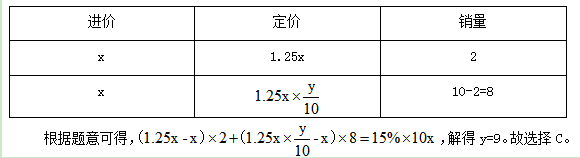根據(jù)題意可得,(1.25x-x)×2+(y-x)×8=15%×10x,整理得y=1.125x。則該商店這次促銷價為定價的1.125x÷1.25x×10=9折。本題選擇C項。