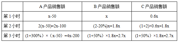 【答案】C【解析】設(shè)第1小時B產(chǎn)品銷售額為x萬元,根據(jù)題意,A、B、C三種產(chǎn)品這3小時銷售額如下表所示: