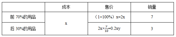 【答案】C【解析】設(shè)這批辦公用品每件成本價x,數(shù)量為10,剩余辦公用品打y折出售,根據(jù)題意,梳理題干信息列表如下: