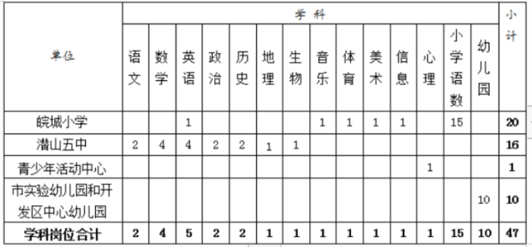 2023年城區(qū)學(xué)校擬選調(diào)教師合計(jì)47名。選調(diào)到皖城小學(xué)的20名教師先安排到開(kāi)發(fā)區(qū)中心學(xué)校任教一學(xué)年,選調(diào)到潛山五中的16名教師先安排到潛山三中和潛山四中任教一學(xué)年(擬選調(diào)人員按潛山三中和潛山四中2023-2024學(xué)年度實(shí)際學(xué)科需求選崗),一學(xué)年后考察合格的分別到皖城小學(xué)和潛山五中任教。具體選調(diào)崗位和名額分配如下表: