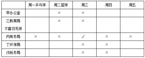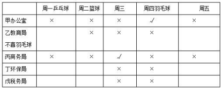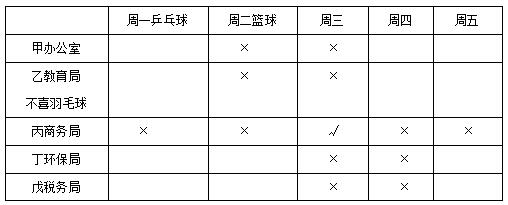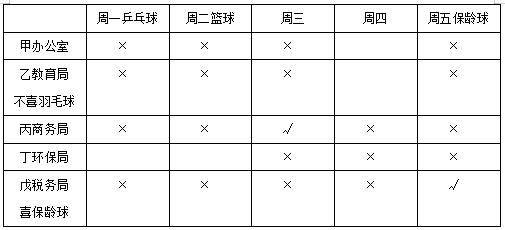 【答案】C【解析】根據(jù)上表可知,丙在商務(wù)局工作,周三休息,不可能喜歡乒乓球和籃球,只有C項符合。