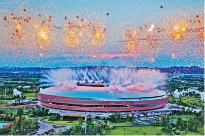 2023年7月28日晚,第31屆世界大學(xué)生夏季運(yùn)動會開幕式在成都東安湖體育公園主體育場舉行。圖為開幕式焰火。新華社記者黃偉/攝
