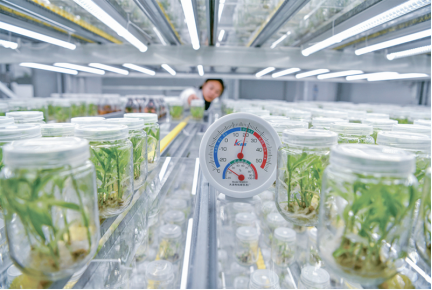 近年來,貴州省依托大數(shù)據(jù)發(fā)展優(yōu)勢,加快數(shù)字化在產(chǎn)品溯源、智能灌溉、智能溫室、精準(zhǔn)施肥等智慧農(nóng)業(yè)新模式的推廣運(yùn)用,提高農(nóng)業(yè)生產(chǎn)效率。圖為工作人員在貴陽市開陽縣南江蔬菜良種繁育中心的組培中心查看小黃姜苗生長情況。新華社記者楊文斌/攝