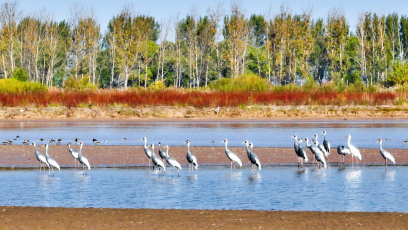 在山東黃河三角洲國家級自然保護區(qū)拍攝的白枕鶴(2022年10月18日攝)。新華社發(fā)(楊斌攝)