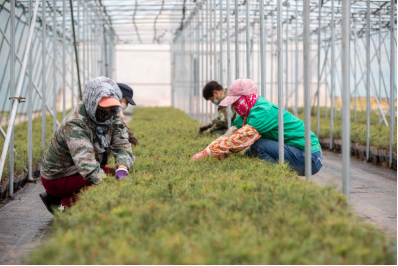 在黑龍江伊春森工集團紅松種苗繁育基地,工作人員在養(yǎng)護輕基質(zhì)紅松苗(2023年5月20日攝)。新華社記者張濤攝