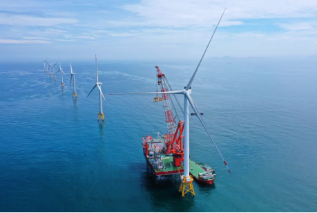 全球首臺16兆瓦大容量海上風電機組在福建北部海域安裝完成(2023年6月28日攝,無人機照片)。新華社記者林善傳攝
