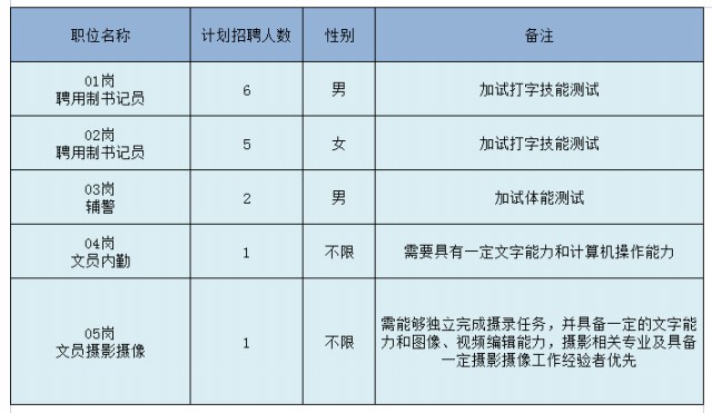 計(jì)劃招聘聘用制書記員11人(男性6人,女性5人),輔警2人(男性),文員2人(性別不限,內(nèi)勤1人,攝影攝像人員1人)。