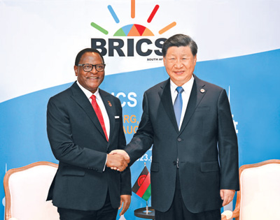 當(dāng)?shù)貢r(shí)間8月24日上午,國(guó)家主席習(xí)近平在約翰內(nèi)斯堡出席金磚國(guó)家領(lǐng)導(dǎo)人會(huì)晤期間會(huì)見馬拉維總統(tǒng)查克維拉。新華社記者 謝環(huán)馳攝