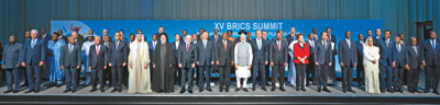 會(huì)議由南非總統(tǒng)拉馬福薩主持,巴西總統(tǒng)盧拉、印度總理莫迪、俄羅斯總統(tǒng)普京(線上)和60多位非洲國(guó)家及其他新興市場(chǎng)和發(fā)展中國(guó)家領(lǐng)導(dǎo)人或代表,以及聯(lián)合國(guó)秘書(shū)長(zhǎng)古特雷斯、新開(kāi)發(fā)銀行行長(zhǎng)羅塞夫等國(guó)際和地區(qū)組織負(fù)責(zé)人出席。這是與會(huì)領(lǐng)導(dǎo)人集體合影。新華社記者李學(xué)仁攝