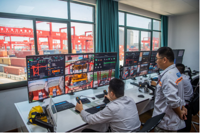工作人員在武漢新港陽邏集裝箱港區(qū)遠程操作機械設(shè)備吊裝集裝箱(2023年7月5日攝)。新華社記者 伍志尊 攝
